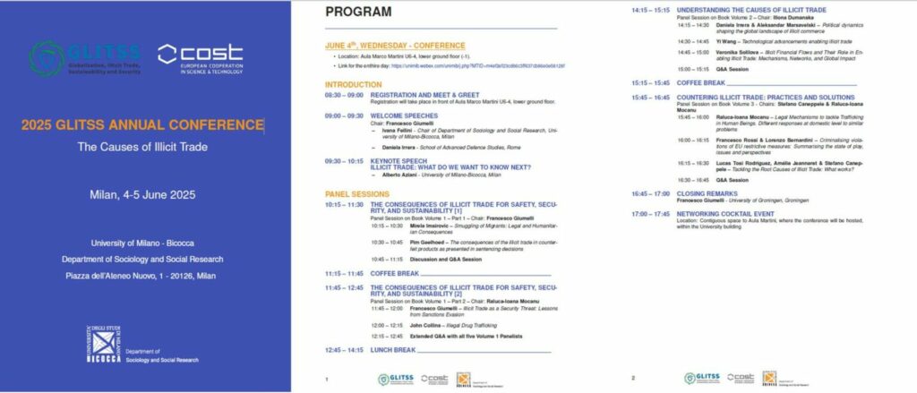 Конференція GLITSS, організована кафедрою соціології та соціальних досліджень Університету Мілано Бікокка, зібрала міжнародних експертів, політиків та науковців для обговорення правових, соціальних і економічних аспектів незаконної торгівлі. Учасники досліджували її зв’язок з міграцією, підробкою, інституційною довірою та глобальними ризиками. Панельні дискусії сприяли формуванню нових підходів до політичних рішень і наукових досліджень, заснованих на доказах.
