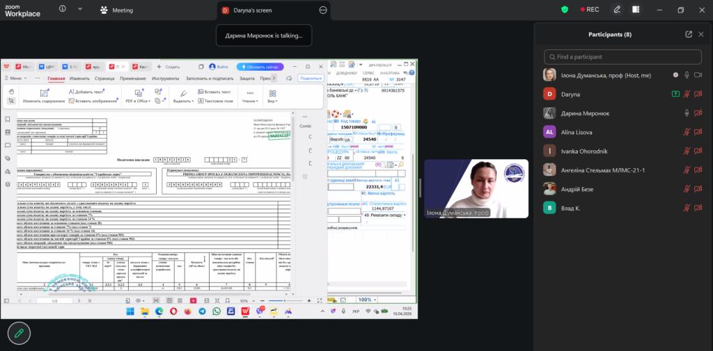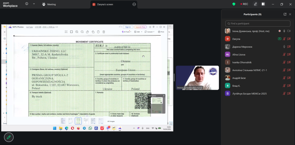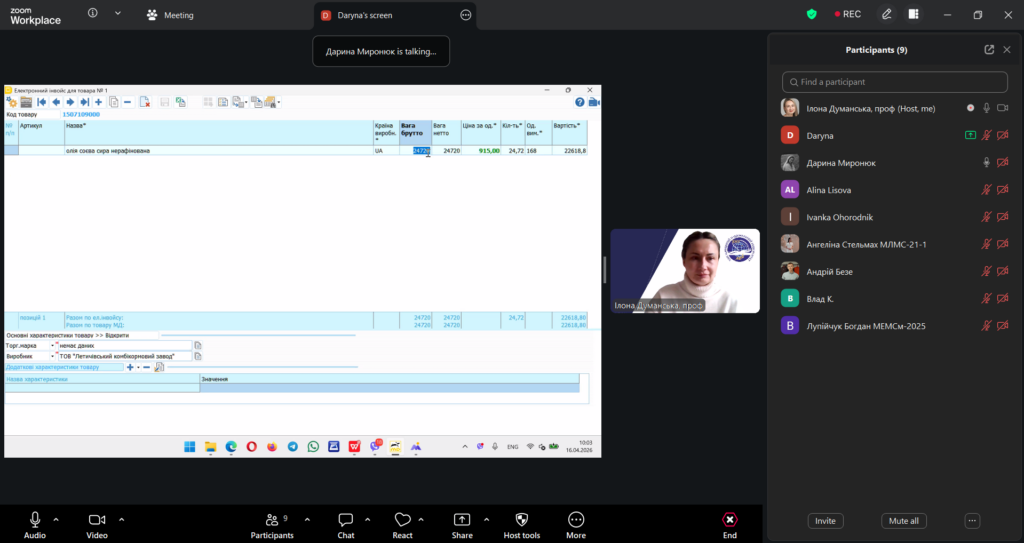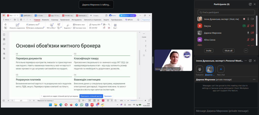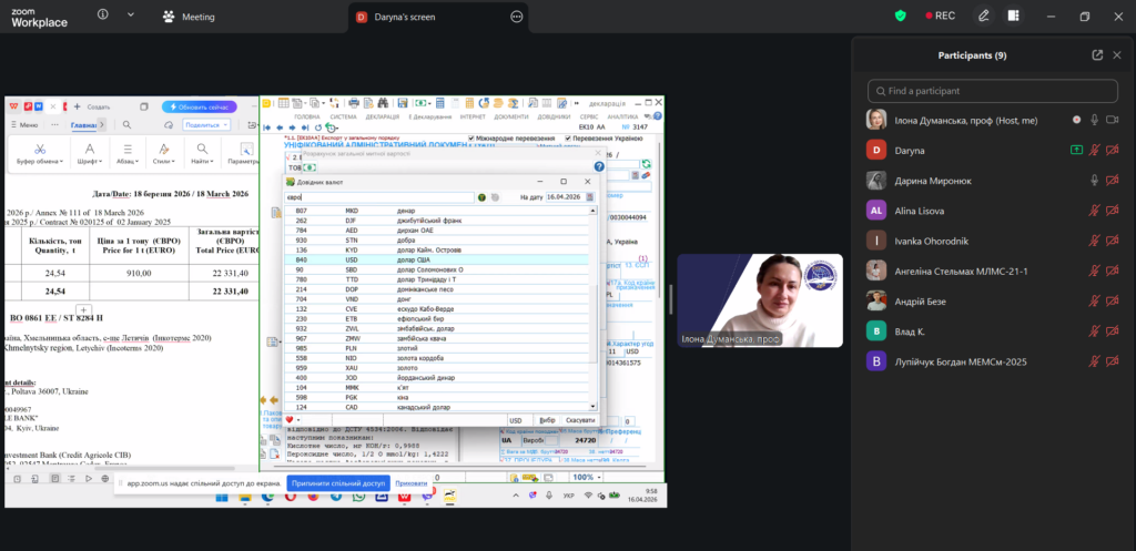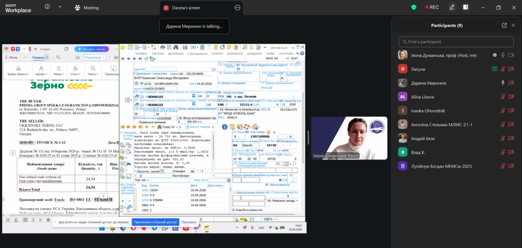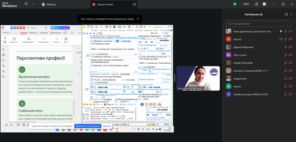 У межах дисципліни «Зовнішньоекономічна політика та митна безпека» освітньої програми «Міжнародна економіка та митна справа» відбулася лекція у форматі peer teaching (навчання рівний-рівному). Її провела студентка Дарина Миронюк, яка працює агентом з митного оформлення у митного брокера та спеціалізується на експортному декларуванні. Лекція відбулася під менторством проф. Ілони Думанської.